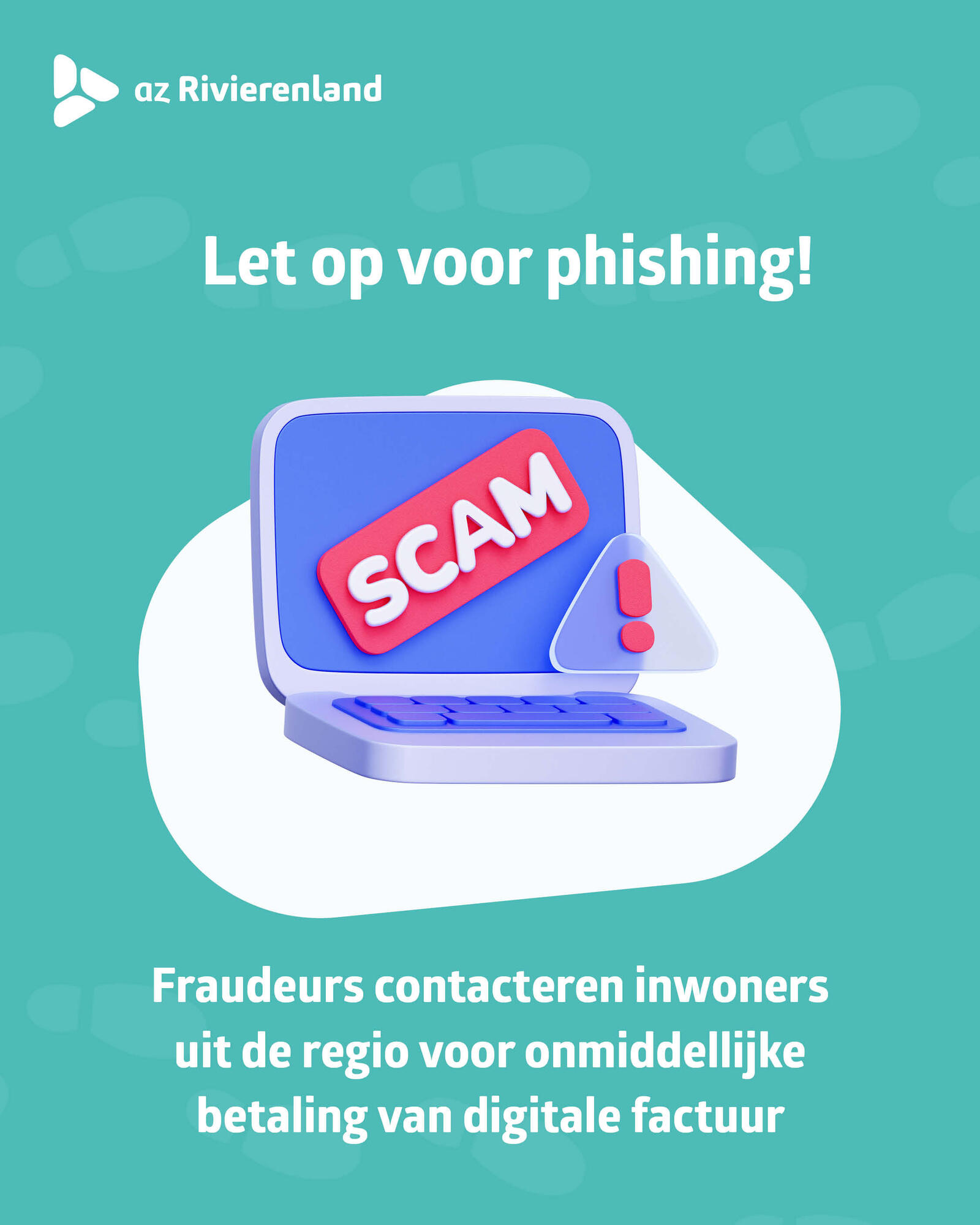 We krijgen meldingen dat fraudeurs contact opnemen met inwoners uit de regio en melden dat ze een openstaande factuur bij AZ Rivierenland hebben. Ze bieden aan dat je deze meteen kunt betalen via een link en een code.